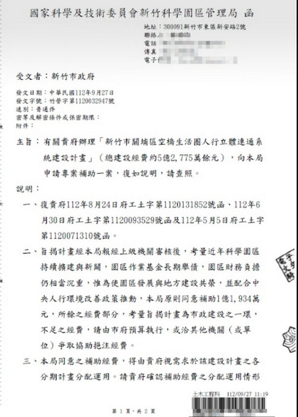 市府自今年五月起,已依都審修正通過方案,啟動市場訪價、詢價、編製合理預算、工期作業,並積極與各營造業者溝通,消弭物價風險疑慮及提高廠商投標意願,廣邀經驗豐富廠商共襄盛舉,預計今年底前工程發包,今(27)日再傳出好消息,經市府全力爭取,國家科學及技術委員會新竹科學園區管理局同意補助1億1,934萬元於關埔空橋建設。