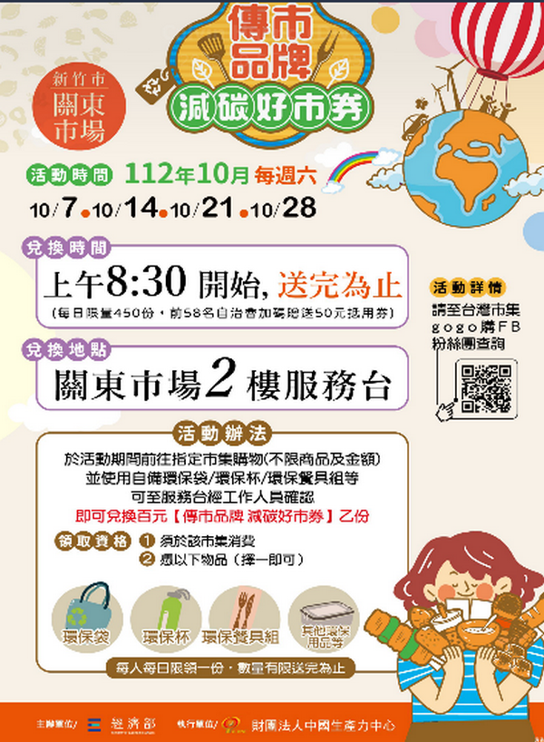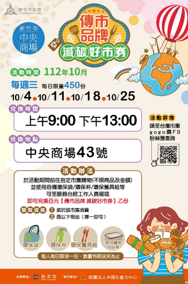 全球暖化對全球帶來極端氣候的重大衝擊,經濟部為響應環保節能減碳政策,聯合全台100處特色市場(集)推出「減碳好市券」活動,竹市東門市場、中央市場、中央商場、關東市場共同參與響應,活動期間只要攜環保袋、環保杯、環保餐具至指定市場不限金額消費後,至該市場服務處出示消費證明,即可兌換100元減碳好市券(限定於該市場使用及10月底前使用),各市場減碳好市券數量有限換完為止,市府鼓勵民眾一起做環保享福利。