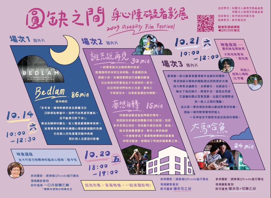 為積極響應每年12月3日國際身心障礙者日,新竹縣政府辦理系列活動,首先登場的是社會處、衛生局、財團法人錸德文教基金會及財團法人廣青文教基金會攜手合作,共同舉辦一系列身心障礙者影展,盼透過影像的力量,提高社會對身心障礙者的關注和理解,將在10月14日、20日及21日分別舉行3場次4部電影,每場影展將聚焦不同主題,包括精神疾病、龍發堂肅清事件、罕見疾病以及智能障礙者的生命故事,邀請民眾攜手賞電影窺見生命的力量。