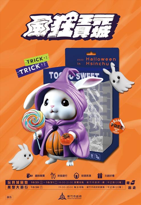 「讓我們萬聖節一起變身玩具,離『箱』出走!」高市長表示,今年萬聖節活動以「玩具」為主題,身穿紫斗篷、手拿棒棒糖,蹦蹦跳跳的搗蛋兔,將在10月25日至10月31日晚上6點至9點於市府1樓的「玩具城展覽」與大小朋友碰面。而孩子們最期待的「萬聖大遊行」,將於10月 28 日晚上7點在市府前廣場盛大展開,歡迎市民朋友裝扮成喜愛的角色,一起從玩具箱中「離箱出走」嗨翻風城。