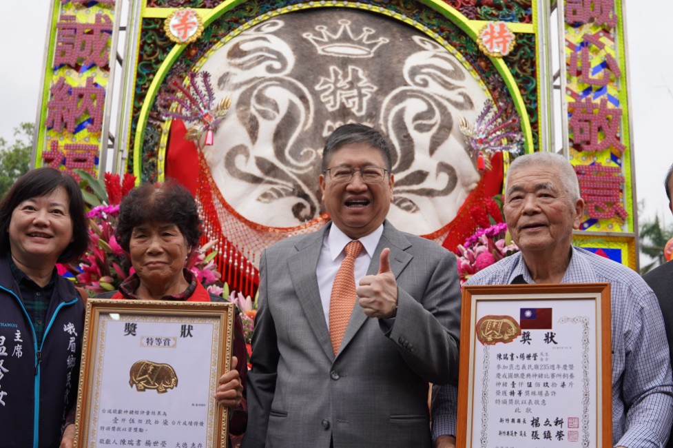楊文科表示,這次共有37頭神豬、6頭神羊參加神豬神羊比賽,他特別頒發獎牌給神豬神羊比賽前幾名獲獎的飼主,其中特等獎神豬重1597台斤,飼主陳瑞書、楊世瑩是他峨眉同鄉,特別合影留念。特等神羊角長度3尺7寸5分,飼主為李克常、羅文殿、劉安瑋、杜宗維、陳忠霖。
