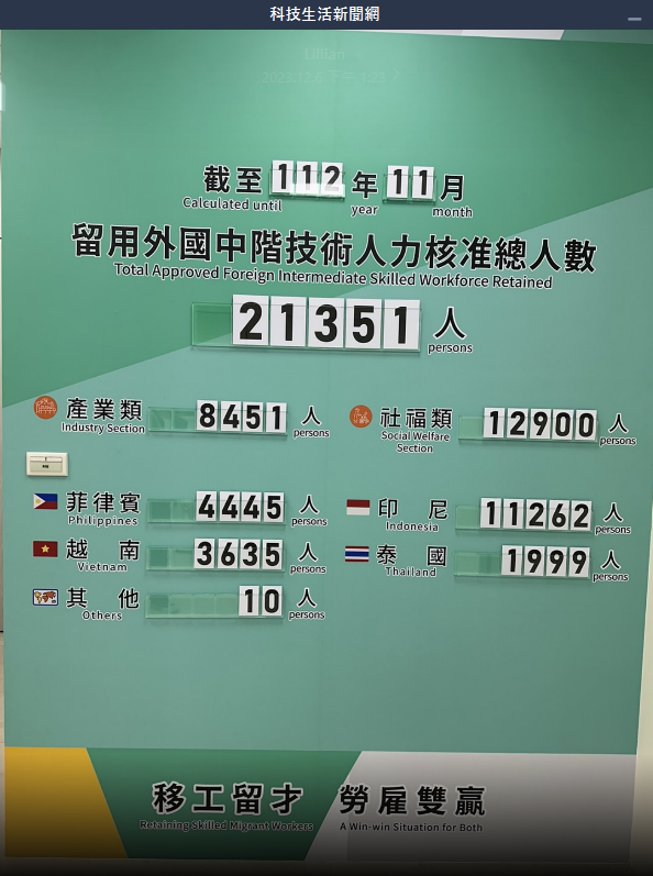 許部長表示,目前在臺移工人數已超過75萬人,從事本國人較不願意從事的辛苦工作,是我國不可或缺的勞動力,移工朋友長時間在我國工作,不僅熟悉我國的生活環境,且有著純熟的技術,就像是我們的家人朋友一樣,共同生活在這片土地,實已成為我國優秀穩定的勞動力,但是因為移工過去受限於法令規定,先前只要在臺累計工作期限屆滿,就必須出國且不可以再來臺工作,導致具有一定技術程度的人才流失。因此,勞動部為解決我國中階技術人力缺工的問題,自去年4月30日起推動「移工留才久用方案」,開放符合轉任中階技術人力資格的資深優秀移工可以繼續留臺工作,且沒有在臺工作年限限制;方案推動至今年11月底止,勞動部已經核准中階技術人力共計2萬1,351人,其中產業類計8,447人、社福類計1萬2,894人。另外,為進一步提供便民服務,提升申辦中階技術人力成效,勞動部在新竹縣成立「移工留才久用服務中心」,提供雇主申辦中階技術人力的各階段相關服務,並透過加強宣導推廣,使外界瞭解聘僱中階技術人力的優點及好處,同時更可以協助雇主解決申辦中階技術人力的各種疑難雜症問題,用心讓民眾感受到「又快」、「又好」、「又方便」的優質服務。