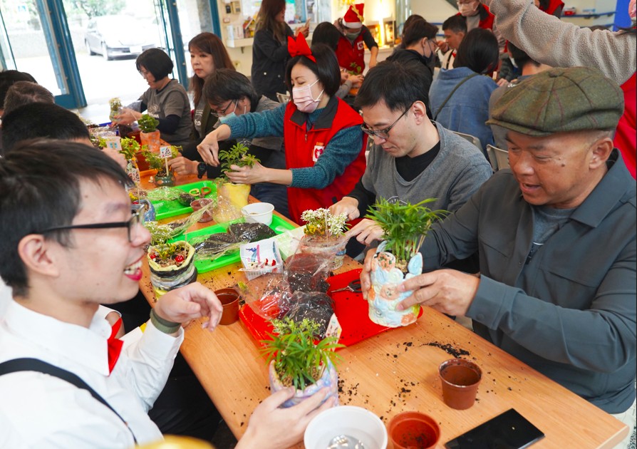 聖誕前夕,高通志工們陪伴仁愛學員一起「聖誕盆栽DIY」,分享園藝活動的樂趣-新竹市天主教仁愛基金會提供