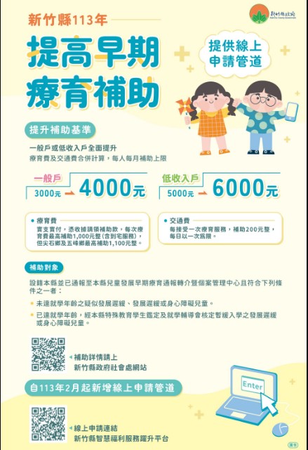 新竹縣政府重視早期療育兒童及家庭權益,積極整合社福、教育及醫療資源,為減輕早療家庭的負擔,新竹縣政府自今(113)年起提高交通費與療育費補助上限,分為一般戶及低收入戶最高補助4000元及6000元,並增加線上申請管道,民眾申請更便利,縣府盡力提供協助與支持,期望讓「慢飛天使」安心成長。