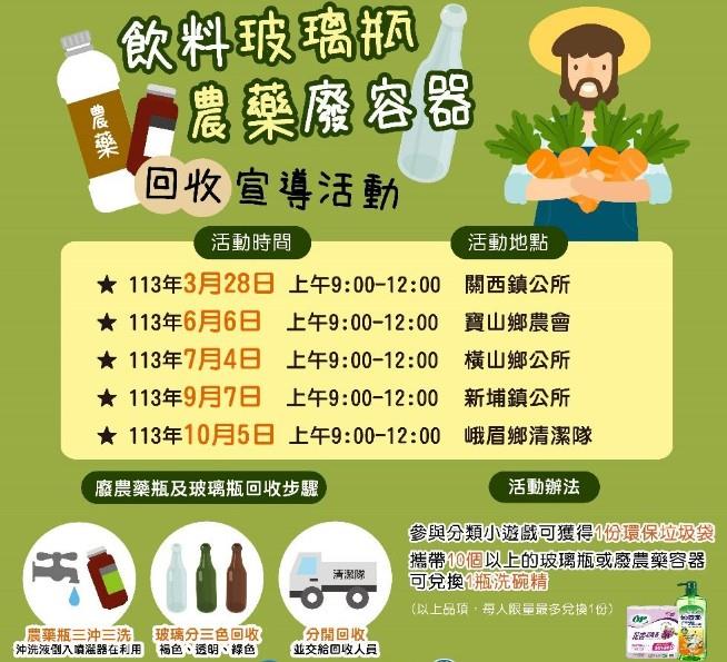 為落實玻璃容器及農藥廢容器資源回收,新竹縣政府環境保護局3月起結合鄉鎮市公所及農會辦理「飲料玻璃瓶及農藥廢容器回收宣導活動」,邀請民眾參與活動換好禮,現場體驗分類回收小遊戲即可獲得宣導品一份,另攜帶清洗乾淨的玻璃瓶或農藥瓶10個以上至現場回收,即加碼兌換精美禮物一份,數量有限,換完為止。
