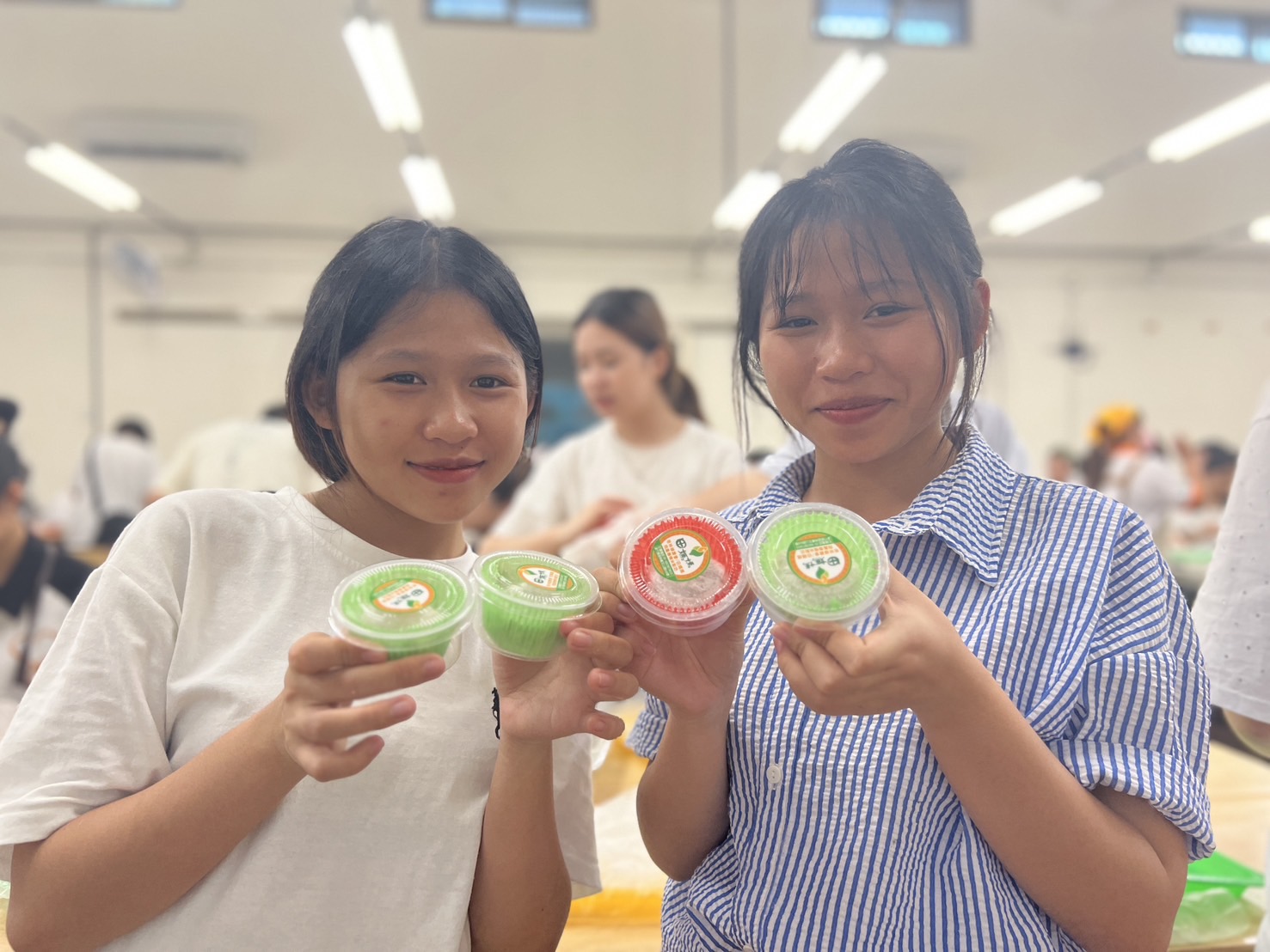 雙胞胎姐妹花陳氏絨 跟陳氏紅一起來就讀國際專修部,來台3個多月一起體驗客家麻糬(大福)的製作。大福的餡料用豆沙包著芎林特產的小番茄,味道很特別。