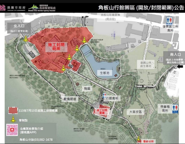 另提醒角板山行館園區仍有部分區域正在施工中,施工封閉範圍包含園區北入口、樟腦收納場事務所、回字館及行館建築物,請民眾遵守園區開放/封閉管制範圍,並依現場管理人員指示進行安全遊憩活動,預計今年年底(梅花季前)將陸續開放,期待遊客再次來訪。