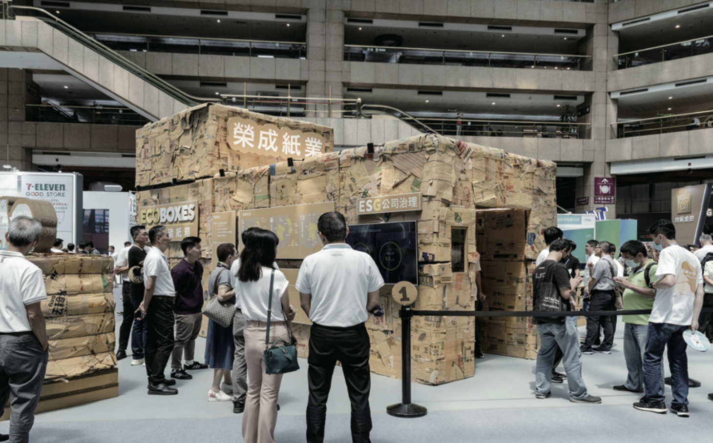 榮成紙業以3R環保概念進行會展規劃,用廢紙磚建造的巨型隧道相當吸睛,連續兩年獲得亞太永續博覽會「綠色設計獎 」最高級別肯定。