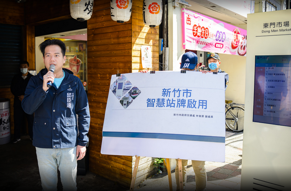 邱代理市長表示,今日竹市首座智慧站牌在東門市場站正式啟用,同時市區內16座也一併啟用,竹市全新的智慧站牌採獨立式及附掛式設計,面板為13吋及32吋,不僅能提供公車到站、日期及時間等基本資訊,也可作為市政宣導資訊及公共活動情報的傳播媒介,讓市民在等公車的空閒時間,能夠隨時了解最新的城市動態與政府公告,打造竹市成為幸福友善、智慧科技的城市。