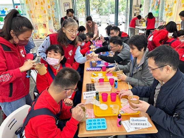 高通侯玉展資深處長(右一)與高通志工陪伴學員一起製作擴香石-新竹市天主教仁愛基金會提供