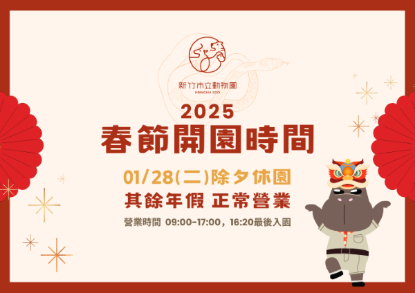 產發處補充,動物園是竹市重要的生命教育場域,持續推動各類寓教於樂的生命教育課程,新的一年將推出更多有趣、富有知識性的活動,歡迎市民朋友踴躍參與,共同探索動物世界的奧妙。提醒參訪民眾,動物園春節僅1月28日(除夕)休園外,其餘年假皆正常營業,營業時間為9時至17時,最後購票與入場時間為16時20分,歡迎大家來動物園走春,開啟嶄新美好的一年。