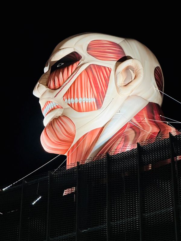 桃園觀旅局說明,巨人大型充氣裝置設置於「城市聚光燈」展區內的亞洲矽谷物聯網(IOT)展廳建築上方,整體裝置寬達10公尺,高達9公尺,再加上建築物的高度,是燈區中最高的展出作品,搭配燈光設計,讓觀賞遊客近距離感受巨人的魅力。一旁還有主題拍照場景,可以與喜愛的角色人物合照打卡,以及「進擊的巨人」周邊商品販售店,好逛又好拍。
