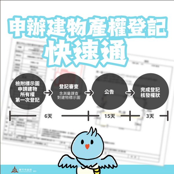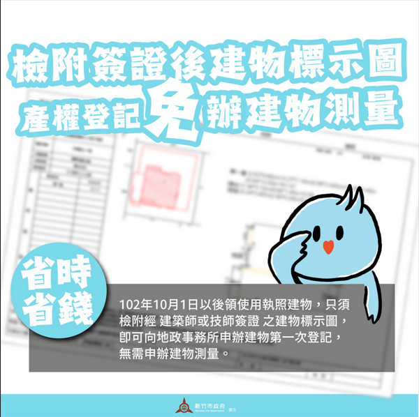 地政事務所表示,凡於102年10月1日以後領得使用執照之新建物,除可依原有「先測量、後登記」方式辦理外,亦可選擇由合法專業技術人員簽證之「建物標示圖」,直接向地政事務所申請建物所有權第一次登記。此新制不僅可節省申辦時間與費用,亦使流程更加便捷與安全。地政事務所歡迎民眾多加運用此便民措施,讓產權登記作業更快速、更順利。