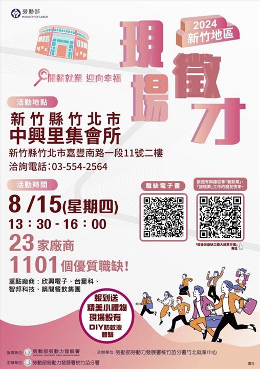 8/15竹北徵才活動 攜手企業釋1,101個職缺 薪資最高上看70K