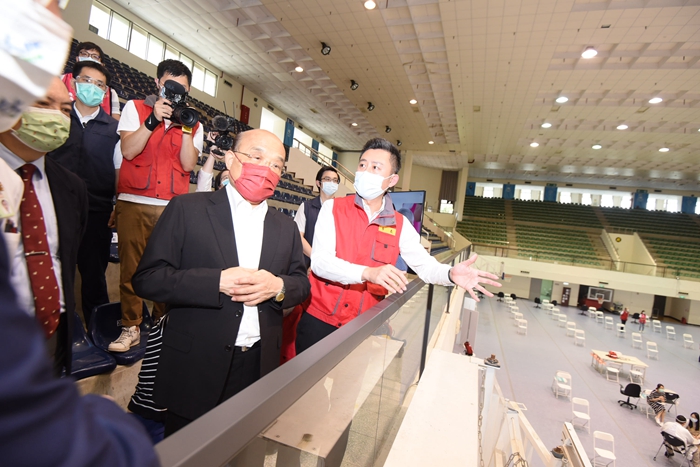 下午行政院長蘇貞昌、行政院發言人羅秉成、立法委員柯建銘、疾管署地區管制中心主任巫坤彬、新竹市馬偕醫院長翁順隆在林智堅市長陪同下參訪孕婦專屬的「體育館疫苗施打站」,關心準媽媽們,見小孩也一同前來,蘇貞昌院長特別向小孩打招呼。林智堅市長則介紹,市府也為跟隨媽媽一起來的大寶準備小椅子、著色圖、玩具小車車等,小孩等候不無聊。媽媽能放心接種。