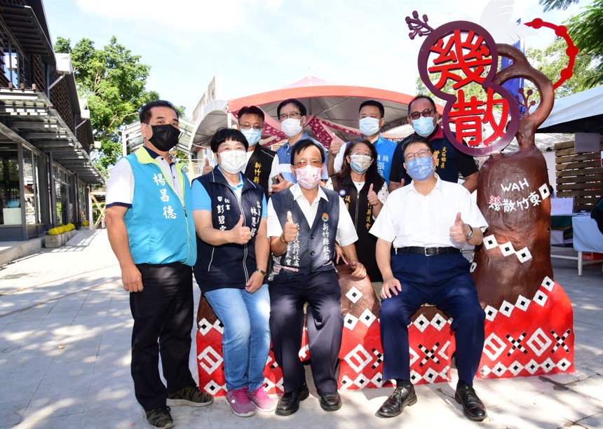 楊縣長與多位貴賓在「Wah!幾散竹東」地標點打卡合照。