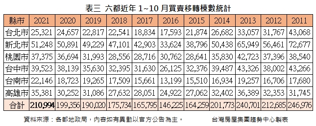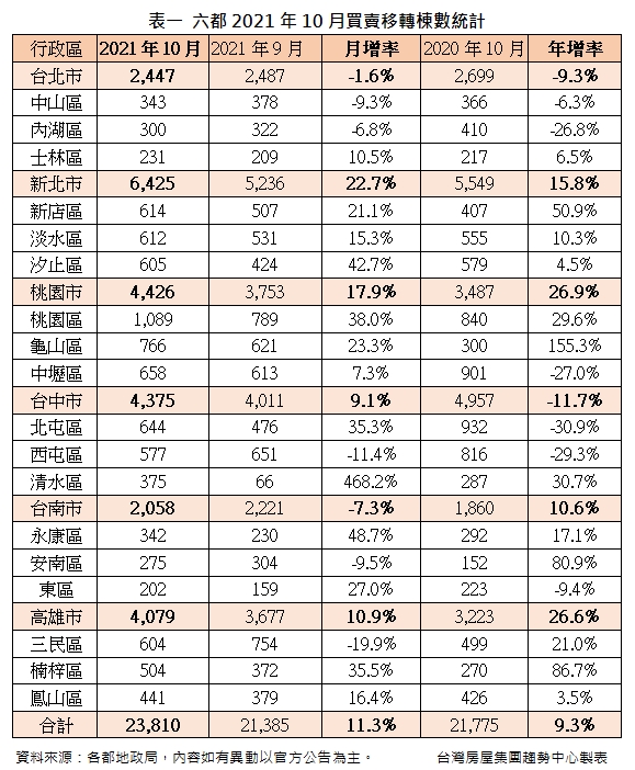 六都10月的買賣移轉量,由北而南依序為台北2,447棟,月減1.6%,年減9.3%;新北6,425棟,月增22.7%,年增15.8%;桃園4,426棟,月增17.9%,年增26.9%;台中4,375棟,月增9.1%,年減11.7%;台南2,058棟,月減7.3%,年增10.6%;高雄4,079棟,月增10.9%,年增26.6%,總計六都共23,810棟,月增11.3%,年增9.3%。