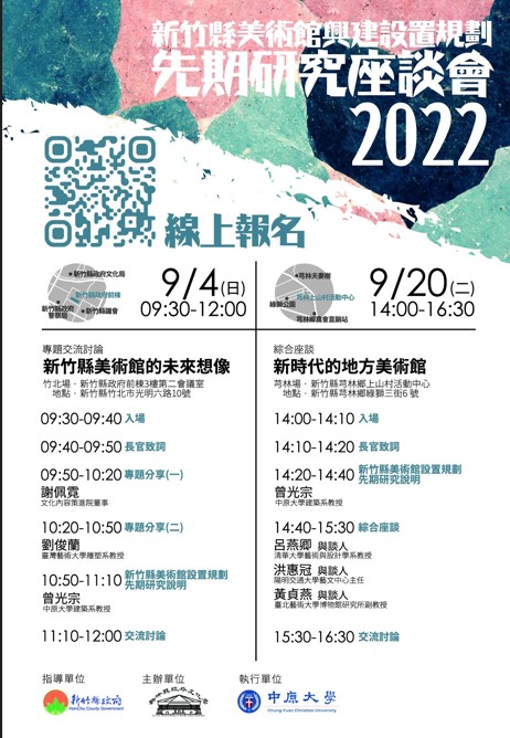 縣府文化局指出,目前縣府正規劃在縣內興建大型獨立專業特色美術館,建立縣內城市美學地標。為求審慎,將先辦理「美術館興建設置規劃先期研究」,預計9月4日上午9時30分,在新竹縣政府前棟3樓第二會議室舉辦第一場座談會「新竹縣美術館的未來想像」,邀請文化內容策進院董事謝佩霓與國立台灣藝術大學雕塑系教授劉俊蘭,分享2場主題。希望探討地方美術館的設置目的、定位、空間與未來發展可能性,思考新時代的地方(縣市)層級美術館,在典藏、研究、展示、教育等功能上,應該如何與時俱進,連結社會及地方,並透過交流討論,共同想像新竹縣美術館的未來。