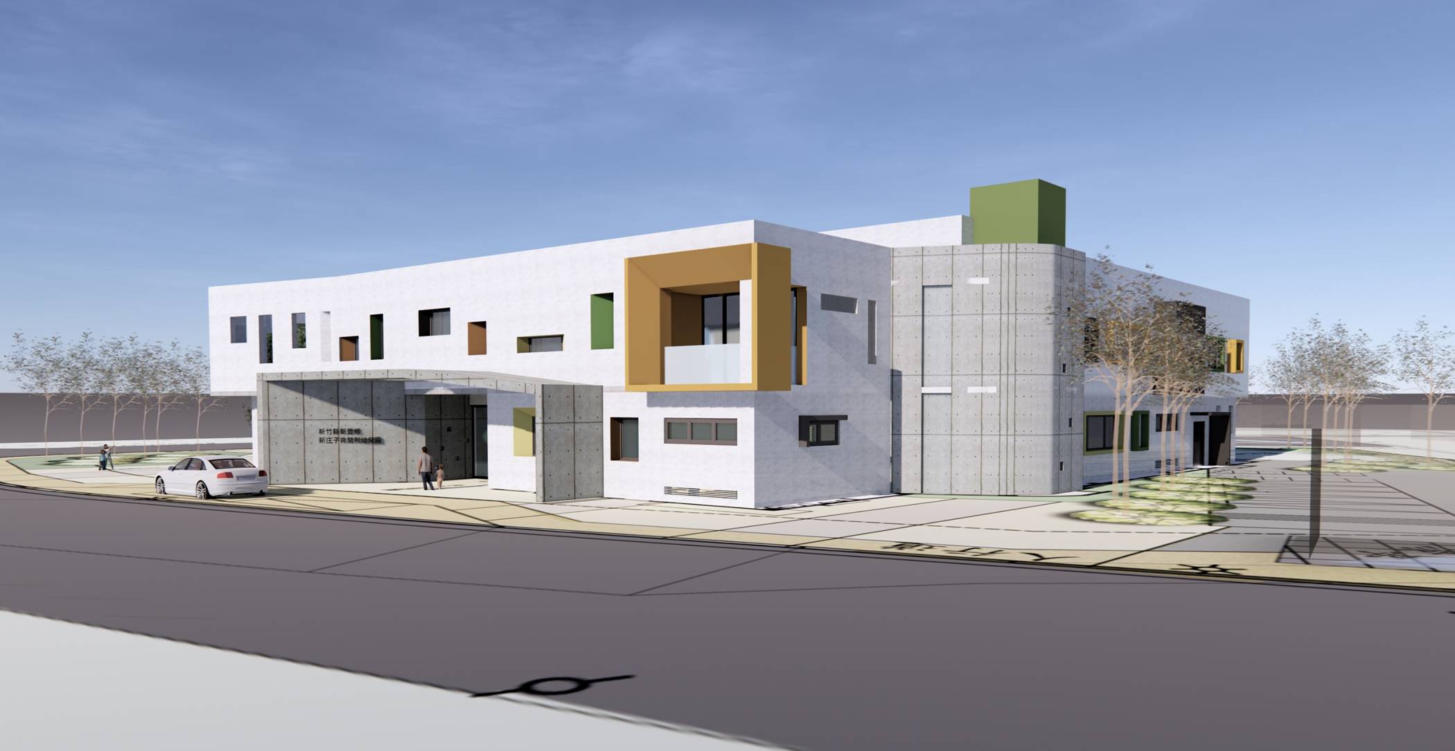新庄子非營利幼兒園外觀設計以客家單身手(橫屋)轉化,為整體構成建築空間,利用深開窗型式阻隔東西曬,同時打造兒童遊戲場域,串聯開放活動。