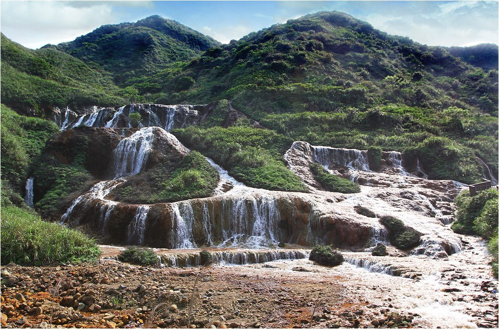金水公路中途點的「黃金瀑布」,河床呈現鮮艷金黃色,宛若大塊裸露的黃金,是遊客最喜愛拍攝的景點。