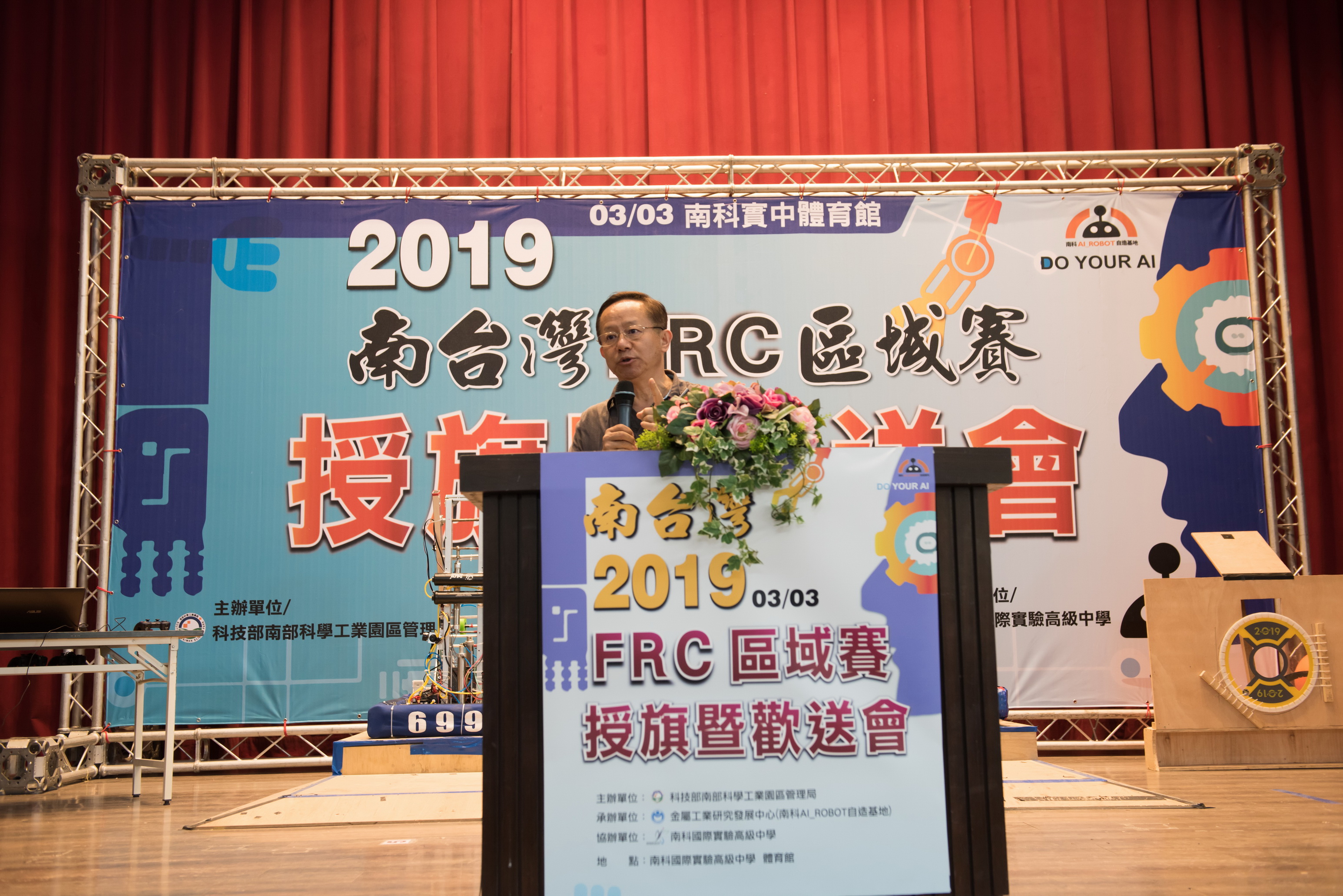 科技部南科管理局林威呈局長首先感謝所有在場的老師、專家與廠商們的支持,才能促成今日的盛會,並送給每位參賽同學一個要求、一個祝福、一個期待,要求同學們出國一定要平安順利,快快樂樂地出門,平平安安的回來;也送每位同學一份祝福,祝福同學出國比賽看到很多、學得很多,大家都能有所成長;更對大家有一個期待,期待在108年3月3日的今天授旗大會後,有更堅定的決心、更強的意志力、更大的努力,去面對FRC競賽的種種挑戰,大聲說出「我們已經準備好了」,期待各位出國拿獎牌回來,為國爭光,讓台灣被看到。