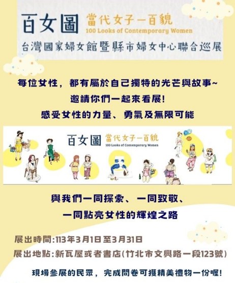 一年一度的38國際婦女節到來,新竹縣北區婦女福利服務中心結合台灣國家婦女館資源,即日起至3月31日,於竹北市新瓦屋或者書店(竹北市文興路123號)辦理「百女圖-當代女子一百貌圖」圖文展,邀請民眾一起來欣賞當代女性的生活百態及精彩故事。