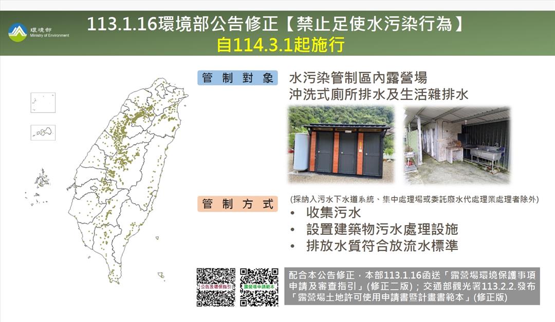 近年全台露營活動盛行,為避免露營所產生的污水直接排放污染水體,環境部去年1月16日公告「禁止足使水污染行為」,今年3月1日起正式實施。環保局表示,對於露營場產生的沖洗式廁所排水及生活雜排水,業者若未採取納入污水下水道系統、集中處理場或委託廢水代處理業處理,以及未收集或未設置建築物污水處理設施等,增列為足使水污染行為,違反規定將依水污染防治法處新台幣3萬元以上300萬元以下罰鍰,期盼業者和民眾共同攜手守護自然環境。