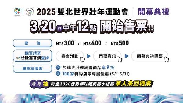 除了許多超優惠消費好康,還有機會抽中「前進2026世界棒球經典賽小組賽」單人來回機票10位,詳情請至世壯運官網/賽會活動/門票資訊/「開幕典禮購票資訊」,就可連結到購票頁面;閉幕典禮於5月30日在鶯歌新北美術館舉行,採民眾自由入場,邀請大家齊聚新北市美術館,一起畫下完美句點。