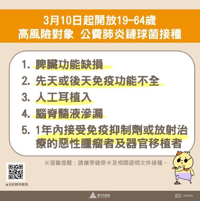 新竹市衛生局積極守護民眾健康,為降低感染疾病風險,今(10)日起竹市配合衛生福利部針對19至64歲侵襲性肺炎鏈球菌感染症(IPD)高風險族群,納入公費施打對象,凡符合資格者將提供1劑13價結合型肺炎鏈球菌疫苗(PCV13)及1劑23價肺炎鏈球菌多醣體疫苗(PPV23),以強化高風險對象疫苗保護力。代理市長邱臣遠呼籲符合資格民眾儘速至新竹市三區衛生所或49家合約院所預約接種,以完善自身免疫,共同守護自己及家人健康。
