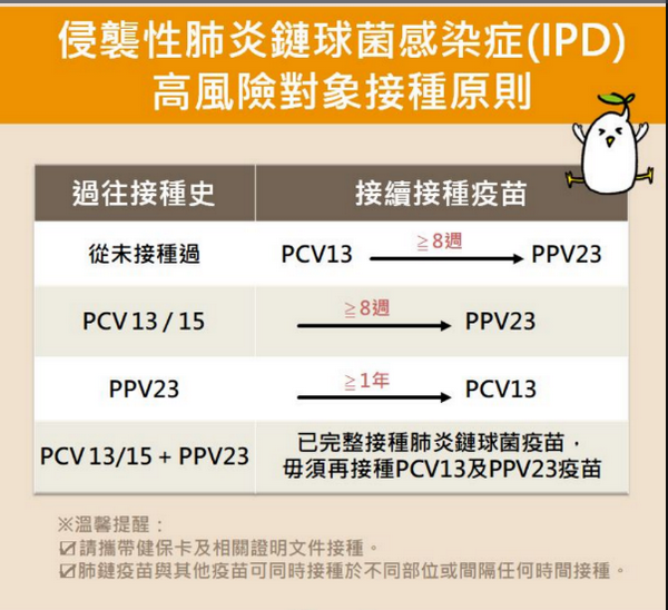 衛生局表示,此次擴大19至64歲IPD高風險對象為脾臟功能缺損、先天或後天免疫功能不全、人工耳植入、腦脊髓液滲漏、一年內接受免疫抑制劑或放射治療的惡性腫瘤者及器官移植者。上述對象只要「接種年」減「出生年」大於等於19歲及小於等於64歲者,就可進行疫苗接種,請符合資格民眾至新竹市三區衛生所或49家合約院所,並檢具診斷書等相關佐證資料,或經醫師依健保就醫資料、病歷等評估後接種。