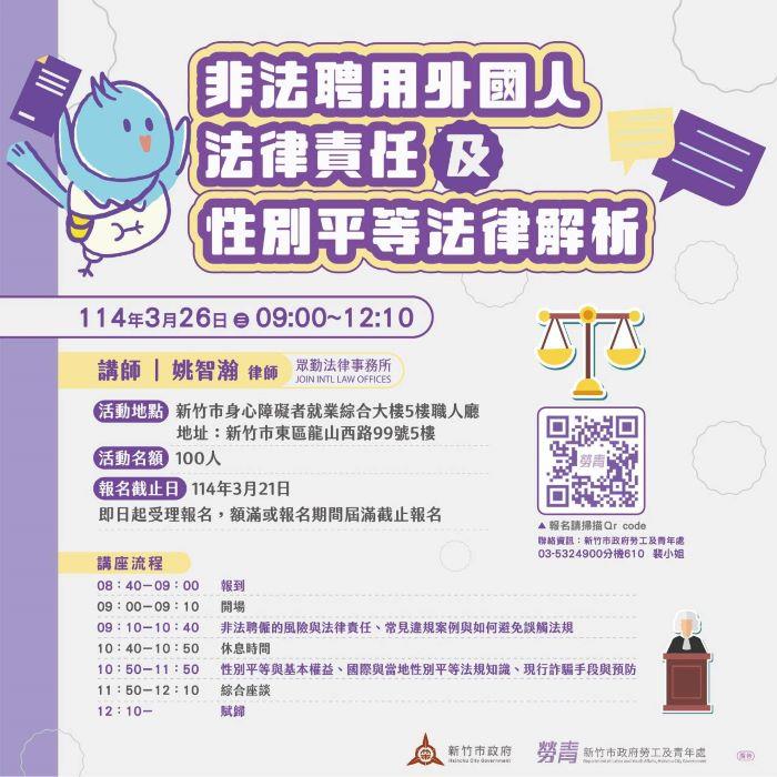 勞青處表示,第2場宣導會將於3月26日舉行,並邀請眾勤法律事務所的姚智瀚律師主講「非法聘用外國人法律責任及性別平等法律解析」。課程將深入探討非法聘僱的相關法規與罰則,並透過司法實務案例解析常見的違規情形及法律適用。此外,活動也將著重於職場平權與性騷擾防治的重要性,幫助企業打造更安全、友善的工作環境。特別地,講座還將分享近期的詐騙案例,提醒企業與勞工提高警覺,避免成為受害者。活動即日起開放線上報名( https://gov.tw/2SH )。