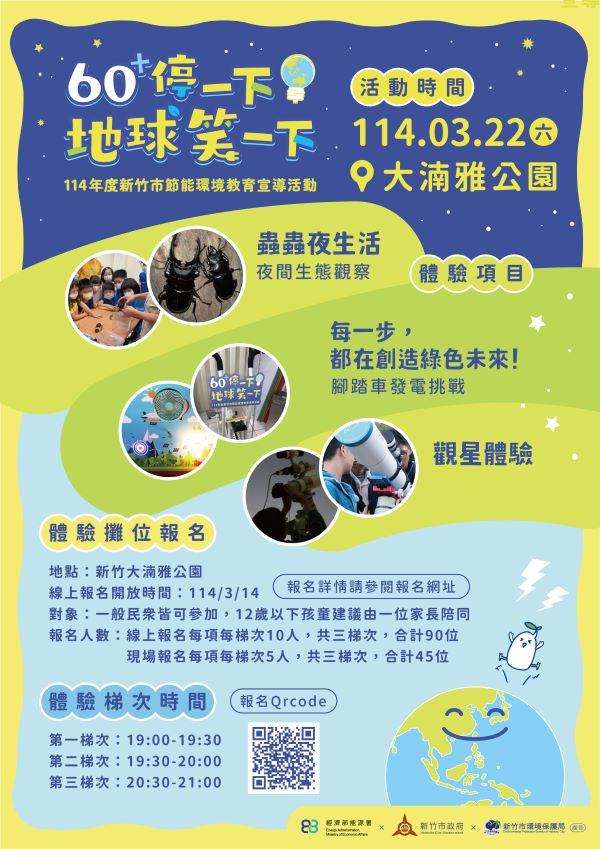 新竹市政府響應0322世界關燈日,宣導民眾節能減碳的觀念與行動,訂於3月22日晚上7時至9時,在大湳雅公園舉辦「60+停一下,地球笑一下」節能環境教育宣導活動。環保局表示,此次活動響應國際Earth Hour地球一小時全球減碳行動,現場安排節能闖關及關燈體驗活動,並邀請竹市學校社團進行精彩表演,歡迎大小朋友踴躍參加,透過趣味活動學習永續節能觀念,共同度過溫馨美好的假期。