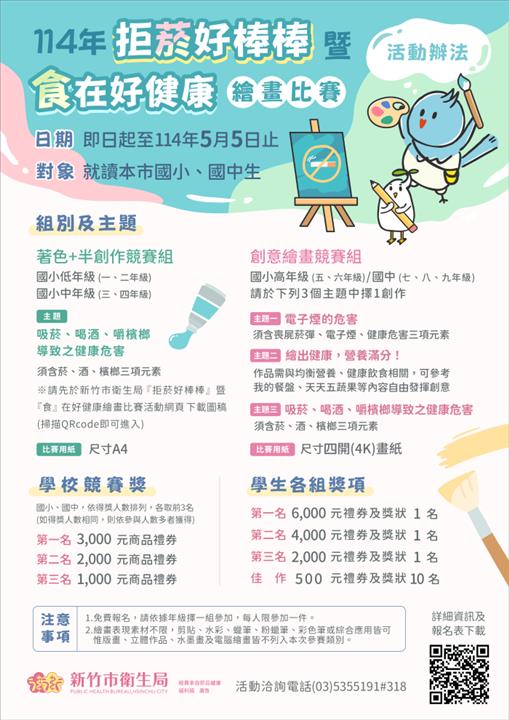 菸害防制與健康飲食觀念從小扎根!新竹市自即日起至5月5日止,舉辦「拒菸好棒棒」暨「食」在好健康繪畫比賽。代理市長邱臣遠表示,新竹市政府希望透過寓教於樂的方式,讓孩子們在繪畫過程中深入了解菸酒、檳榔及電子煙的危害,並認識健康飲食對身心的重要性,繪畫比賽的活動訊息可至衛生局官方網站( https://dep.hcchb.gov.tw/ch/home.jsp?id=6&parentpath )查詢,此次比賽的最大獎項為6,000元禮券,歡迎竹市國小及國中生踴躍報名參與。