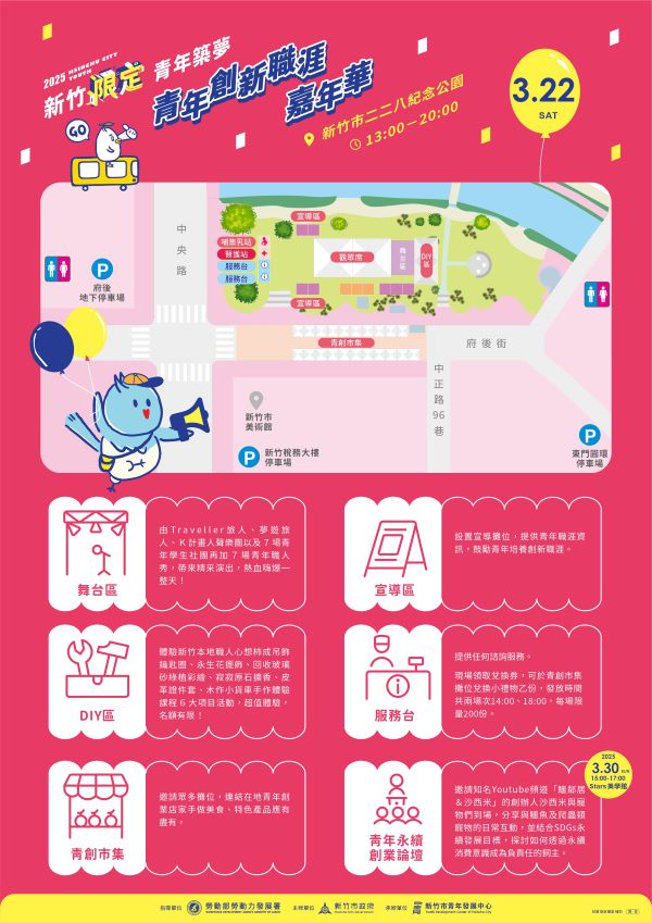 專屬青年朋友的「新竹市青年創新職涯嘉年華」將於3月22日(六)下午1點至晚上8點,在新竹市228紀念公園登場!創新職涯嘉年華策辦豐富多元的系列活動,包含青年創業市集、職涯體驗DIY課程、青年職人秀、青年社團展演及樂團LIVE演出,期望透過多元探索與實踐,啟發青年勇敢追夢,拓展職涯視野。代理市長邱臣遠歡迎青年朋友踴躍參與,透過體驗與交流,發掘職涯無限可能。