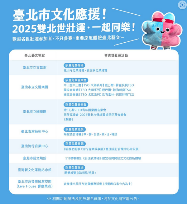 為了讓世壯運參加者能更全面地感受臺北文化魅力,北市文化局特別推出了一系列加碼文化展演活動。加碼活動涵蓋了藝術館所、音樂會及展覽等,眾多藝文場館響應此次盛會,並提供參賽會期間的專屬優惠。活動內容包括:「音樂會」:臺北市立國樂團音樂會,票價享7折優惠,並推出免費贈票活動;臺北市立交響樂團的「TSO大師系列」及「名家系列」音樂會提供限量免費名額。「展覽」:臺北表演藝術中心場館語音導覽限量免費名額;臺灣新文化運動紀念館導覽;臺北流行音樂中心文化館的「唱我們的歌」展覽,參加者可享250元票價優惠,並有限量免費名額。「藝文場館」:臺北市立美術館憑證免費入場,台北當代藝術館憑證半價,多家藝術館所免費參觀,包括台北偶戲館、孫運璿科技人文紀念館、李國鼎故居及芝山文化生態綠園等及臺北市各音樂展演空間Live House提供來店招待或優惠,上述相關訊息及報名資訊將在四月上旬於文化局官網公告。