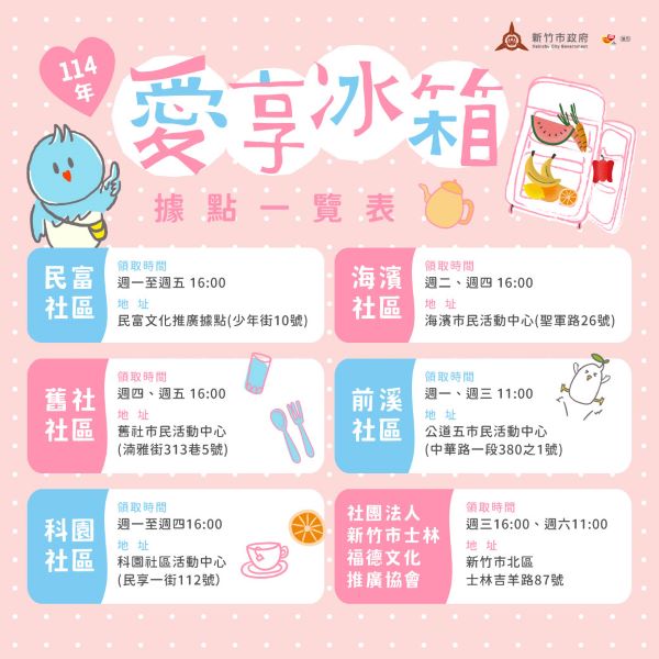社會處表示,市府持續推動愛享冰箱計畫,目前共有6個愛享冰箱據點,為讓更多單位參與食物分享計畫,自113年起開放多元組織團體加入冰箱據點行列,讓每一口食物發揮應有價值。有意願加入社區愛享冰箱據點,或對相關事宜有任何疑問,歡迎聯繫社會處社會行政科或竹市社區培力育成中心,與竹市府共同努力,為減少食物浪費及關懷社會做出貢獻,打造宜居永續幸福真永遠的竹市,新竹市社區培力育成中心專線:(03)5329085。