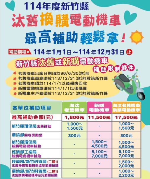 為響應國家2050淨零排放目標,加速淘汰高污染老舊機車,新竹縣政府自即日起正式受理「114年度機車汰舊及低污染車輛補助計畫」,最高補助金額可達新臺幣17500元,鼓勵縣民汰舊換新,一起守護清新空氣,共同打造永續健康的生活環境。