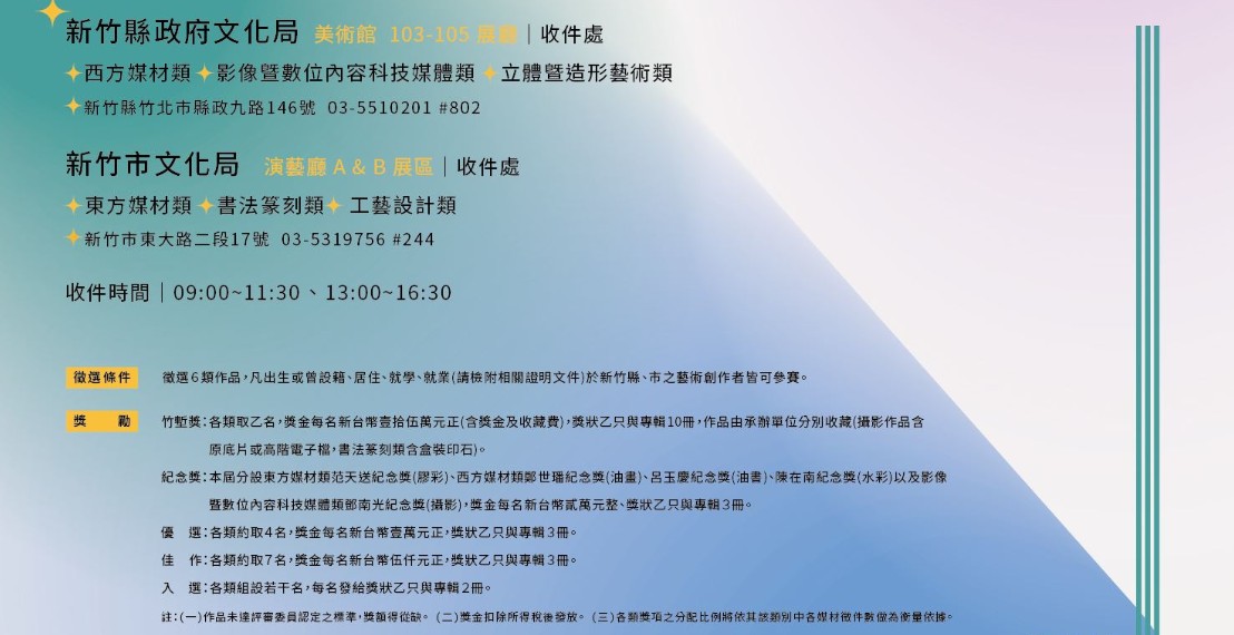 文化局表示,徵件時間為114年5月28日至5月30日止,收件時間為9時至11時30分、13時至16時30分,並請民眾自行依參賽類別送達指定的收件地點。西方媒材類、影像暨數位內容科技媒體類、立體暨造形藝術類,請送至新竹縣政府文化局美術館。東方媒材類、書法篆刻類及工藝設計類則送至新竹市文化局演藝廳A、B展區。