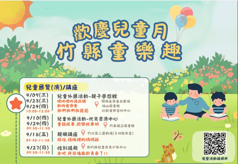 為歡慶兒童月的到來,新竹縣政府社會處透過公私協力合作推出「歡慶兒童月.竹縣童樂趣」系列活動,自4月3日起至30日共舉辦39場活動,包含親職講座、嬰幼兒主題課程、親子童樂會及兒童健康篩檢等活動等,活動不但豐富多元,更重質重量,歡迎大小朋友一同走進童趣世界,度過歡樂又充實的兒童月。
