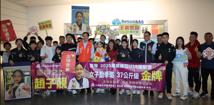 2025年世界中學生U15運動會跆拳道代表團凱旋歸國,新竹縣國手趙子靚昨(15)日晚間抵達國門,新竹縣長楊文科與選手教練及親友團一同熱情接機,為趙子靚初登國際賽即摘下金牌喝采,並安排2004年雅典奧運跆拳道金牌國手陳詩欣驚喜現身給予鼓勵,趙子靚哽咽表示「感謝所有支持她的人,她會繼續努力!」。