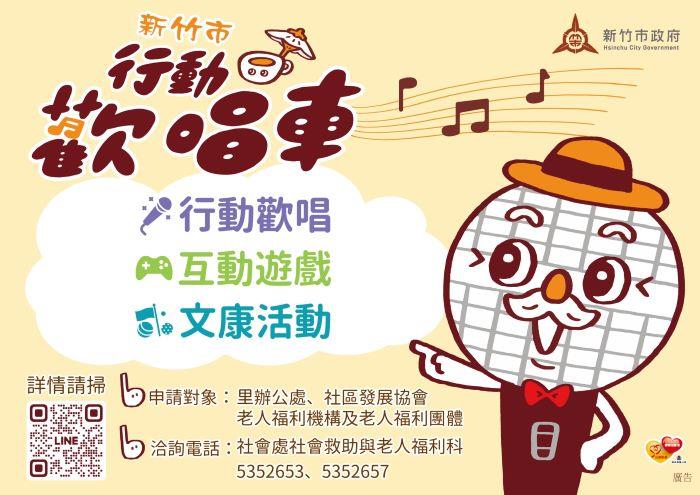 社會處補充,希望透過老人文康巡迴服務,在每一次的互動與陪伴中,不僅帶來歡樂與溫暖,也能將市府的社會福利資源與相關施政資訊傳遞給長輩們,讓他們更清楚了解政府的用心與關懷,並能實際受益、提升生活品質。目前竹市114年1至6月的「行動歡唱車」活動場次已全數額滿,市府即日起開放預約登記114年7至9月份的活動場次,邀請有需求的社區鄰里、關懷據點、老人福利機構及老人團體踴躍報名,共同打造充滿關懷與活力的高齡友善城市。