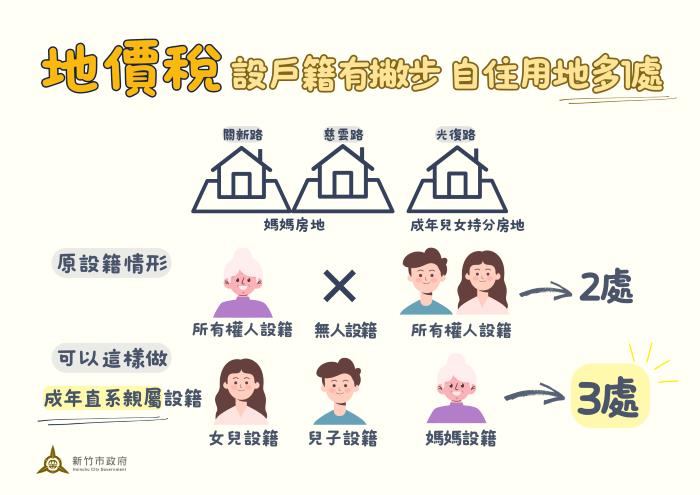 關心地價稅自用住宅用地怎麼選?新竹市稅務局教你這樣選最划算!竹科李媽媽在關新路及慈雲路各有1間房屋,分別由自己及2個成年兒女設立戶籍,並享有地價稅自用住宅用地優惠稅率2‰。最近,兄妹倆合資在光復路買了新房,打算將戶籍遷入,如此一來,慈雲路房屋的地價稅就會被改按一般用地稅率10‰至55‰課徵,李媽媽為此感到十分困擾,不知道要怎麼做,才能同時讓3間房屋的地價稅都適用自用住宅用地稅率?其實,只要將李媽媽的戶籍遷入光復路的房屋,兄妹2人分別遷入關新路及慈雲路,則3戶房屋都有直系親屬辦竣戶籍登記,皆可申請按自用住宅用地價惠稅率課徵地價稅。