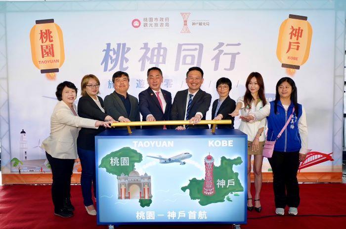 日本神戶機場於今(4/18)日正式升格為國際機場,桃園-神戶直飛航線為首日啟航的國際航線之一。桃園市副市長蘇俊賓今日出席「桃神同行-旅遊零距離」儀式,與神戶市議會坊恭壽議長及議員、眾議員和田有一朗與北神圭朗,以及神戶市觀光局訪團共同見證這項歷史性時刻。蘇俊賓強調,此次直航是桃園與神戶友誼的深化,更是兩地文化與觀光交流的重要里程碑。
