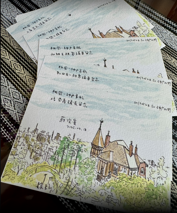 為紀念這次直航,蘇俊賓特別準備了「全球限量10份」的紀念禮物——由他親手繪製的北野異人館明信片,贈送給本次參加首航的神戶嘉賓。他提到,這幅作品是他八年前拜訪神戶時,見證了北野異人館的歷史之美,並將這份感動轉化為畫筆下的線條。明信片上特別寫有「桃園神戶首航」字樣,紀念這段新的友誼航線開通。