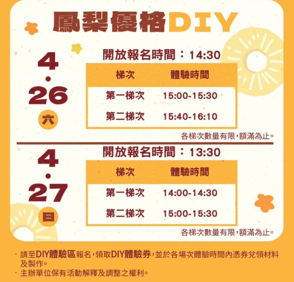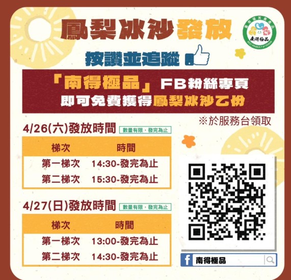 首場市集活動將在4 月 26 日至 27 日正式開跑,並與臺南市政府攜手合作,特別邀請近期受地震影響的楠西、玉井、東山、南化等地小農參與設攤,販售當令蔬果、農產加工產品與特色伴手禮,為消費者帶來安心、健康又直送的新鮮選擇。市集現場也安排吉他音樂表演、買鳳梨鮮果享專人免費削鳳梨,以及台灣鯛試吃品嚐等活動,讓各位在購買農產品的同時,也能享受悠閒假日時光。