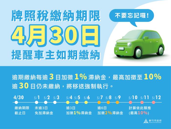 114年度使用牌照稅已自4月1日開徵,繳納期限至4月30日止。新竹市稅務局表示,今年度共開徵17萬2,366輛車,稅額14億2,969萬元,據統計截至4月16日,尚有58%的車主未完成繳納,提醒民眾儘速繳納,以免逾期被加徵滯納金。