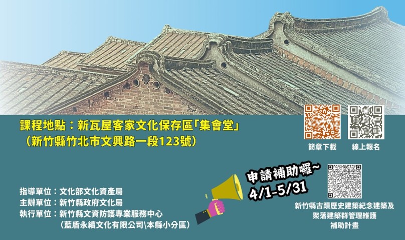 為鼓勵公私有文化資產管理人進行日常維護、定期檢修、防災防盜、緊急應變、使用或再利用經營管理等作為,新竹縣政府文化局114年度規劃「古蹟價值.共下守護」系列課程預計3場,第1場將於114年5月9日在新瓦屋客家文化保存區辦理,歡迎各界人士踴躍報名。