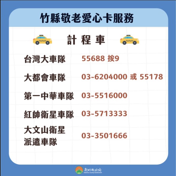 為鼓勵長輩及行動不便縣民走出家門、參與社交,新竹縣政府推出敬老、愛心卡搭乘公車、台鐵、國道客運、計程車,並可用於運動健身,其中111年9月開辦的敬老愛心計程車,因為便利和可及性獲得熱烈回應,2年半以來搭乘人次成長10倍。為提昇服務量能,縣政府將於今年5月5日起,新增大文山衛星派遺車隊加入竹縣敬老愛心計程車,計程車簽約數量將增加162輛、總數達2519輛提供服務。