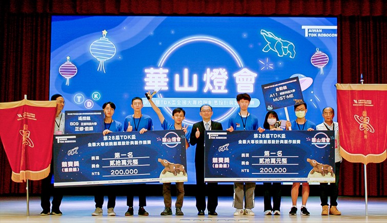 明新科大電子系展現學術與專業實力,鼓勵學生參加競賽累積實作經驗,圖為電子系師生隊伍(右)獲得第28屆TDK盃「自動組」冠軍