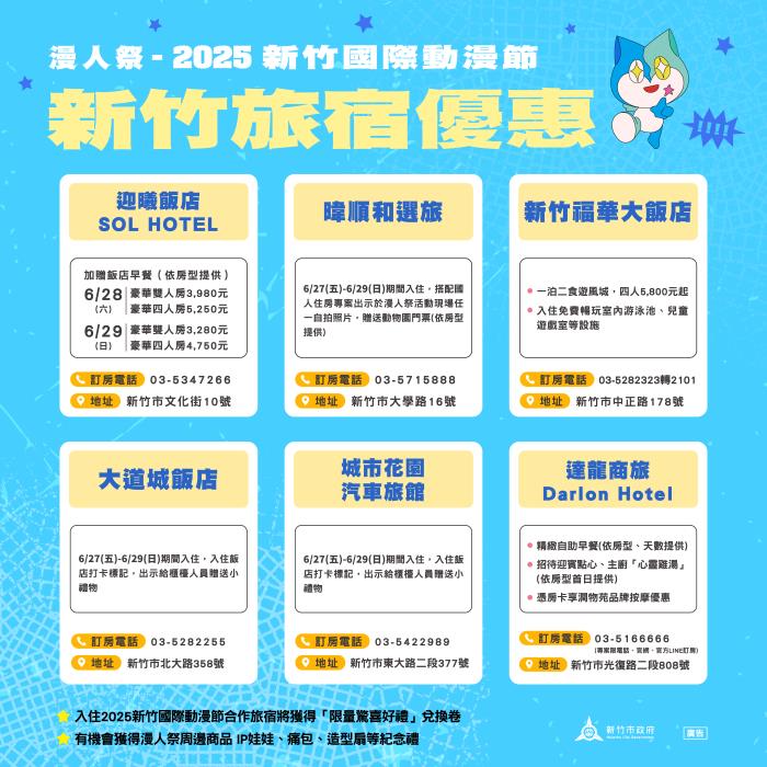 文化局表示「2025新竹國際動漫節」邀集來自日本、韓國、台灣超過20位動漫藝術家參展,並結合新竹漫畫家創作與在地6所學校聯展,共同打造新竹獨有的動漫盛會。為吸引更多動漫愛好者參與,市府更與迎曦飯店、暐順和選旅、新竹福華大飯店、大道城飯店、城市花園汽車旅館、達龍商旅等多家新竹旅宿合作,於活動期間入住合作旅宿,不僅享有專屬優惠好康,還可獲得「漫人祭」限量好禮兌換券,活動期間至主場館服務台即可兌換好禮,送完為止,快來搶先預訂住宿專案。